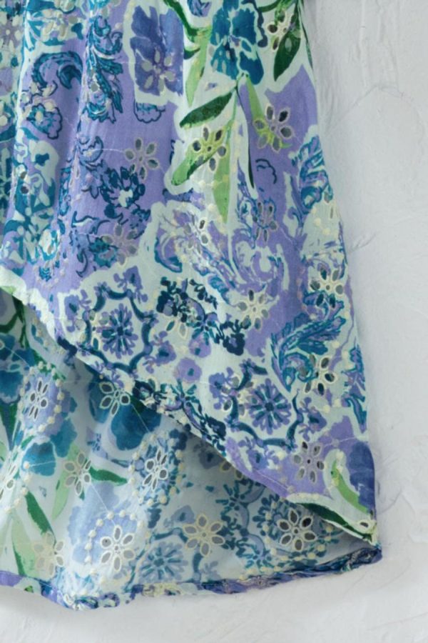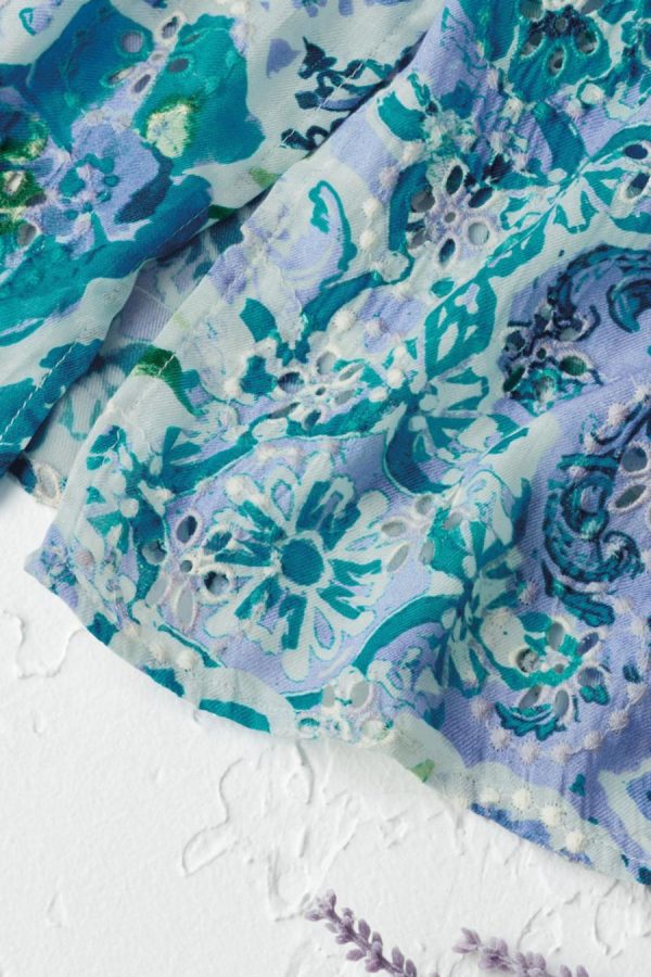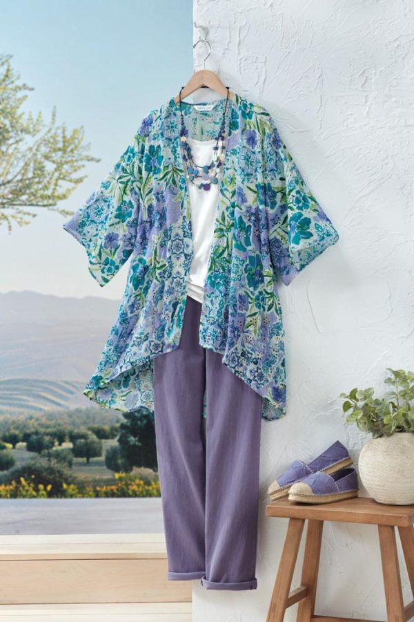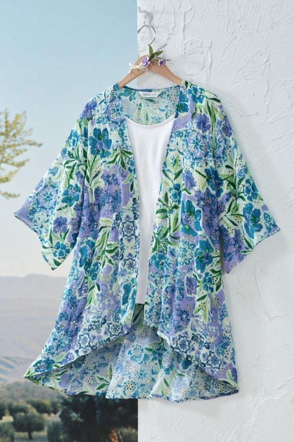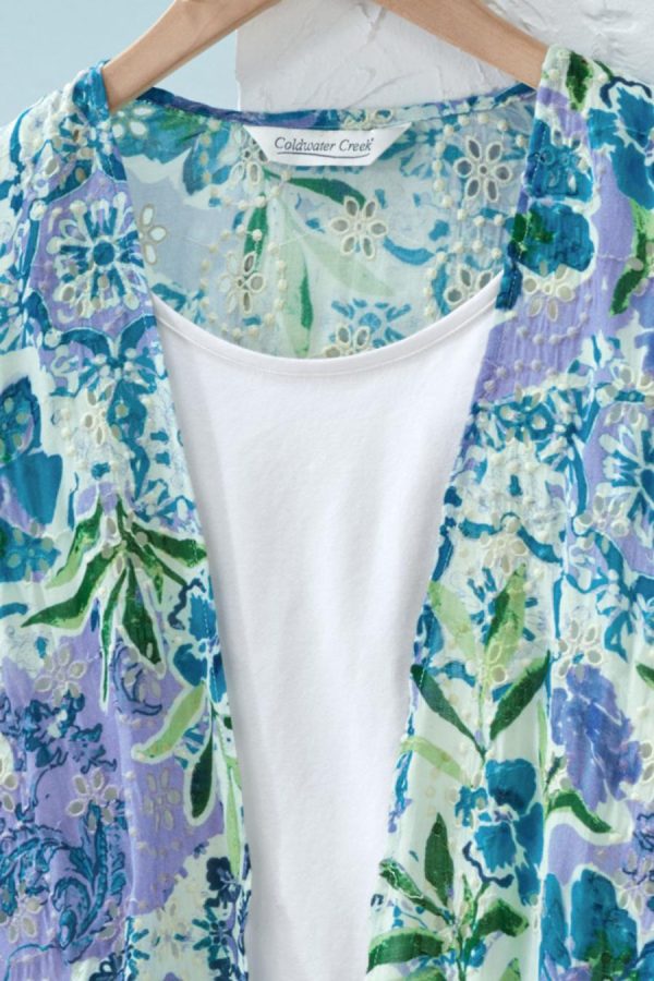A charmed expression of lively florals and eyelet details, all mixed in one artful layering piece. Open-front style has armholes and stitched-down sides, with kimono 3/4 sleeves.
