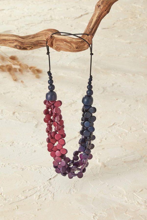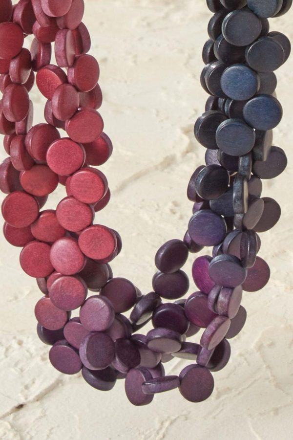 This statement wood necklace features multiple strands of vibrant disks that create an artful ombré effect. Lightweight and handmade, from the mother-daughter Sylca design team.