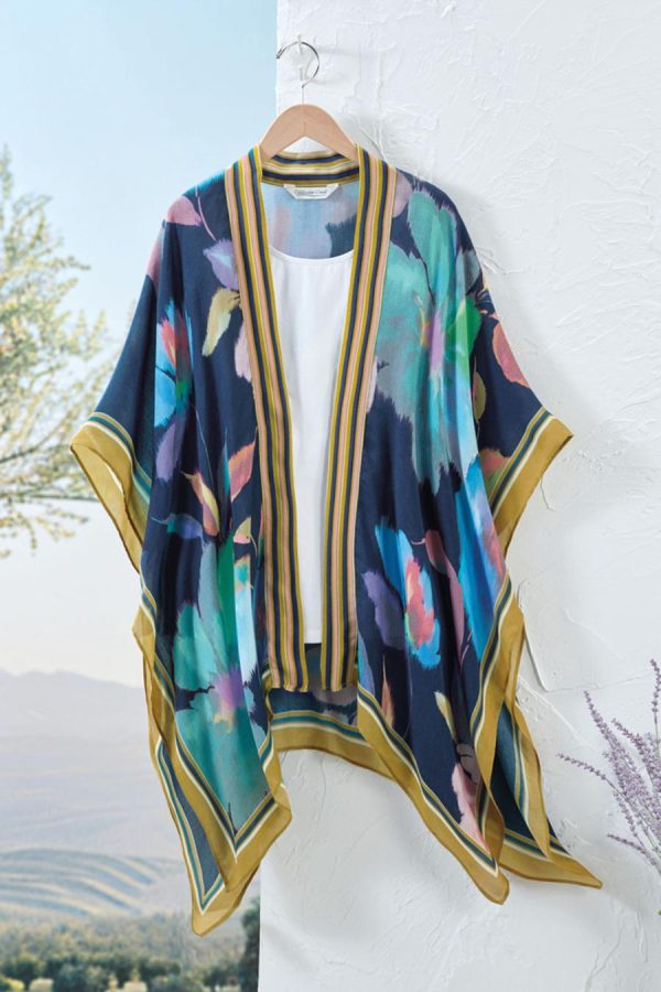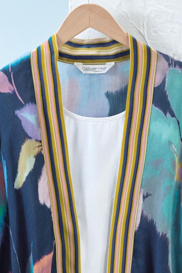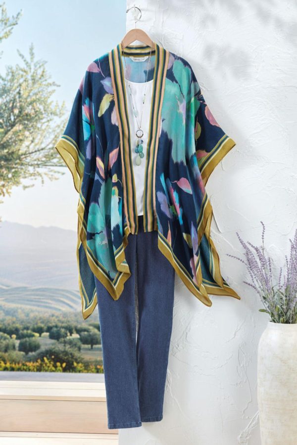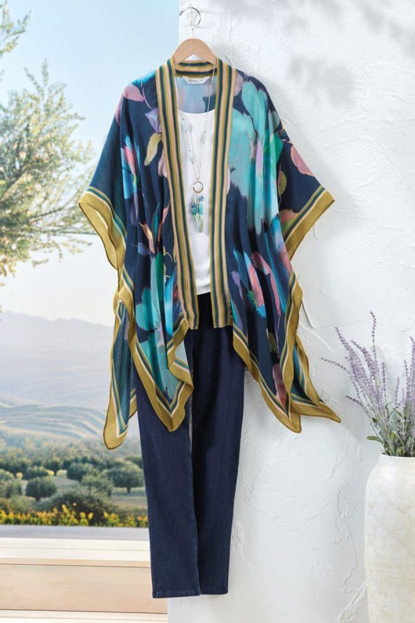 Dream big with a bold, blown-up floral print and contrasting border. Lightweight and flowy, this open-front topper has armholes and stitched-down sides.