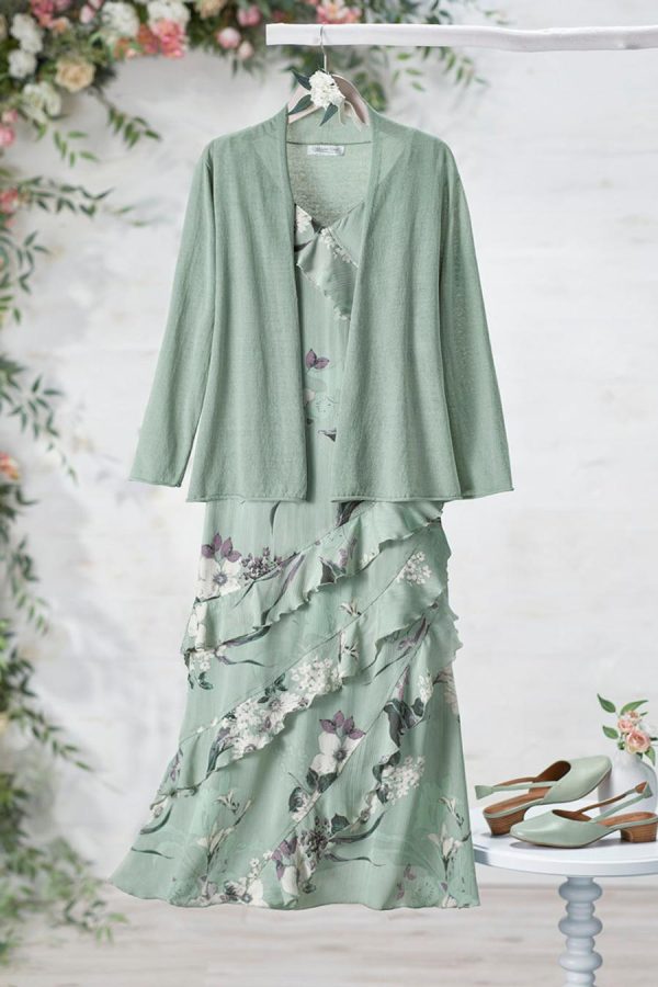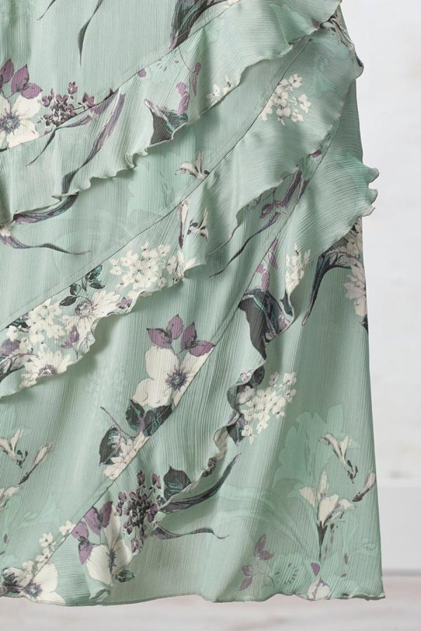 Ode-to-spring watercolor florals, in a dress that’s softly elegant. Slipover style is cut on the bias, with ingeniously slanted ruffled tiers that create movement and a graceful silhouette. Fully lined. Shrug sold separately.