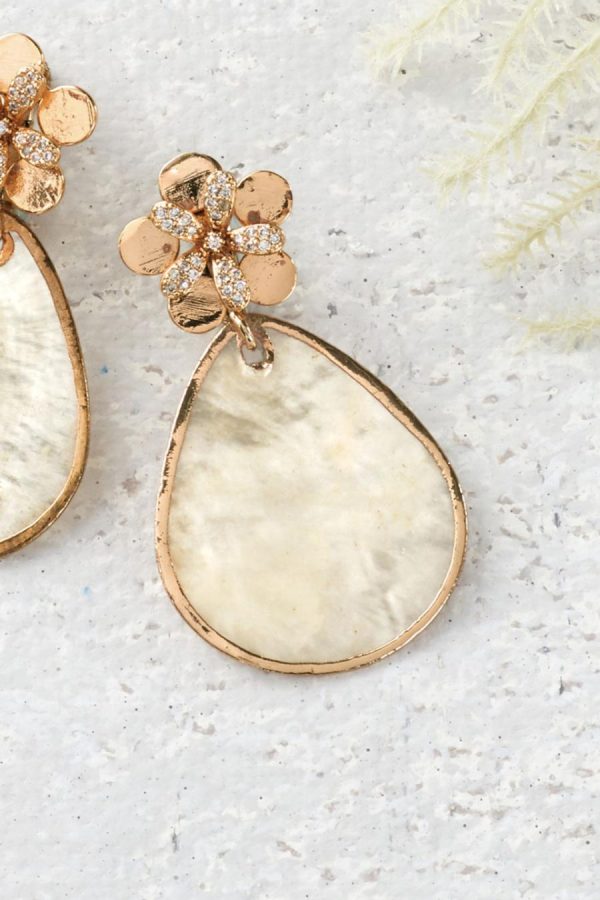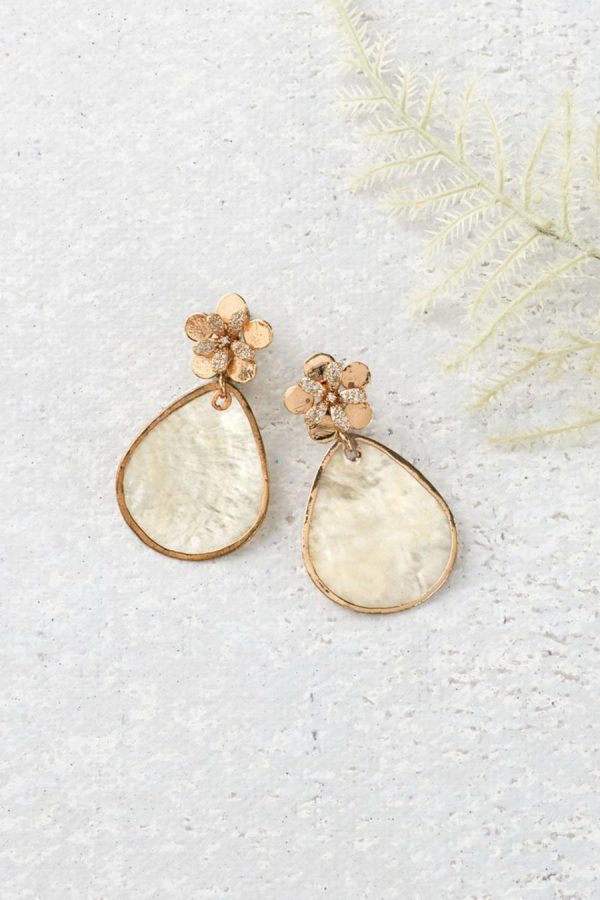 The shimmer of petal-shaped shell dangles, topped by jeweled flowers. Add a touch of magic to your look with these handmade earrings, lightweight and lustrous.