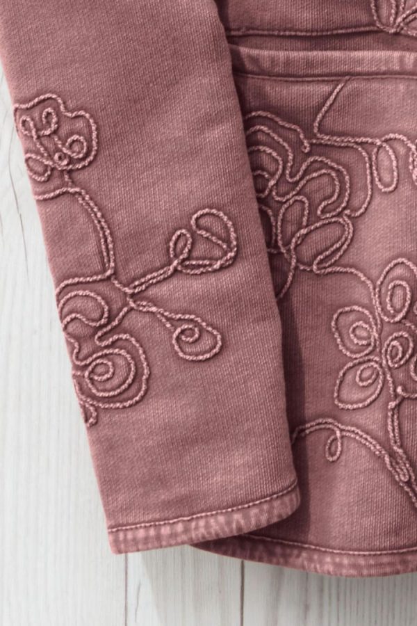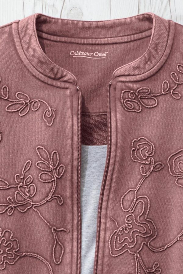 A favorite soft sweatshirt, in a fresh new silhouette. Yarn-dyed cotton terry is accented with tonal embroidery on the front, with a full zip closure, banded collar and welt pockets. Midweight style with solid back, side slits at hem. Relaxed fit, hits mid hip. 100% cotton. Machine wash