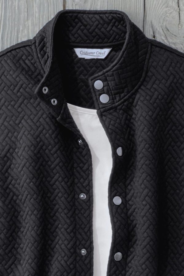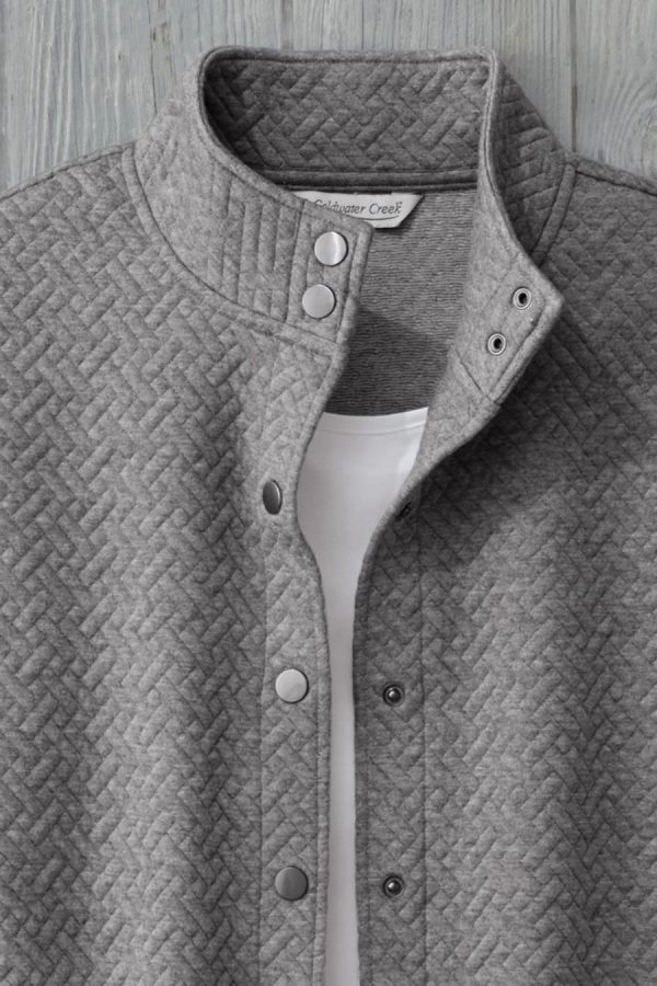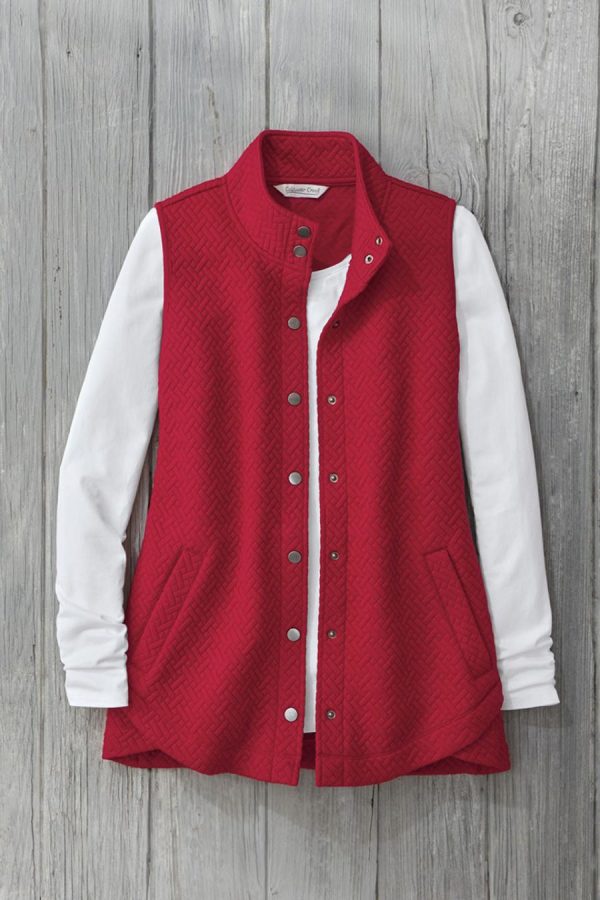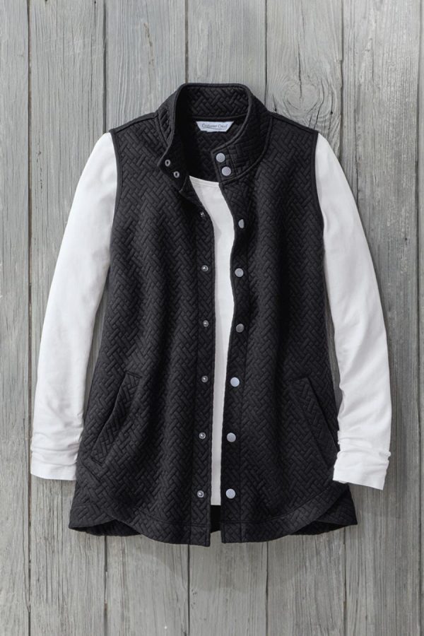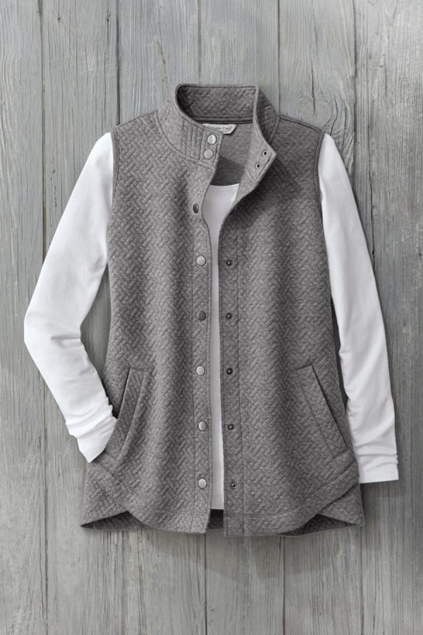 A soft,comfortable layer with a special style touch. Our jacquard knit vest featuresa snap front, a basketweave quilt-like design and a high-low tulip hem – plusslant pockets!