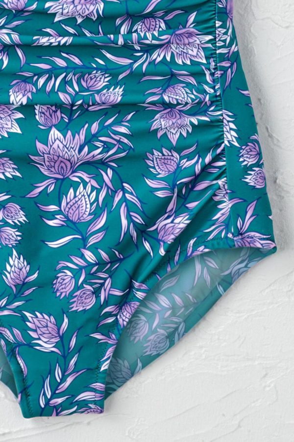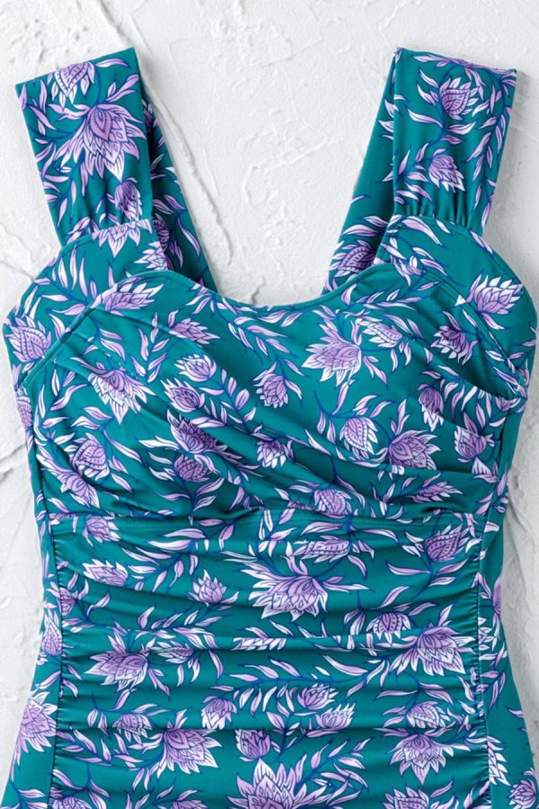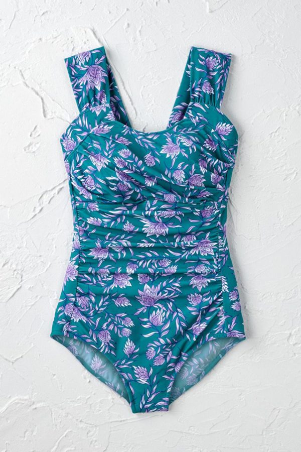 Our flattering one-piece suit makes a splash in a two-tone wildflower print. Ruched at the waist, bust and straps, while our inner power mesh ShapeMe panel smooths and shapes inside. Soft, wide straps provide an exceptionally comfortable, flattering fit. Silicone grip dots keep the leg openings in place. Shelf bra with fixed cups, straight back. UPF 30 for UV protection, chlorine resistant.