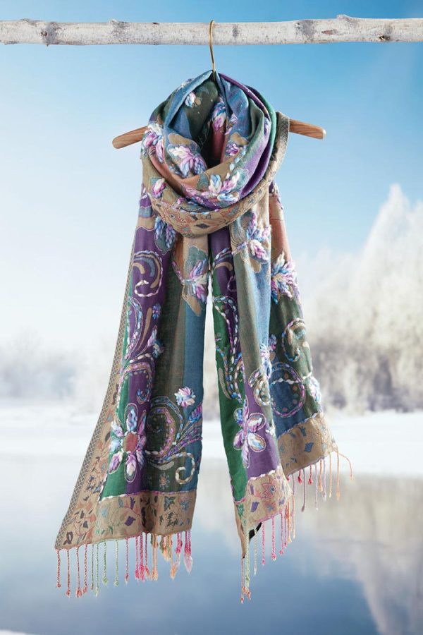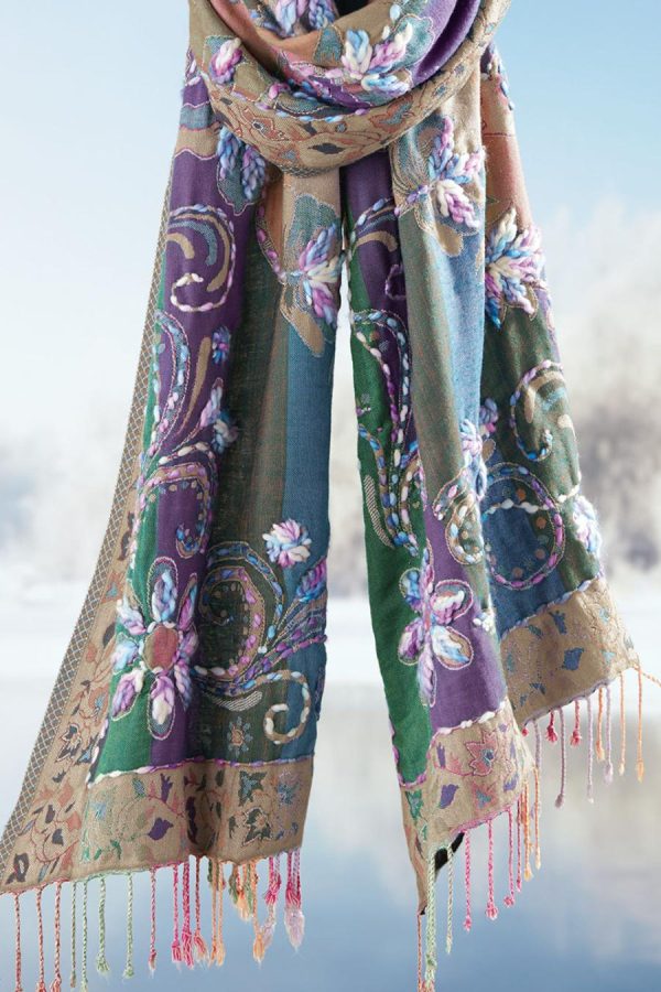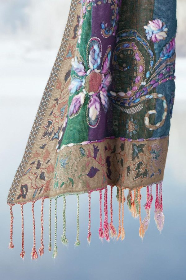 With hand-embroidered florals and space-dyed yarns, this scarf adds color and whimsy with an artisan touch. Each is subtly unique – plus it’s reversible for great versatility.