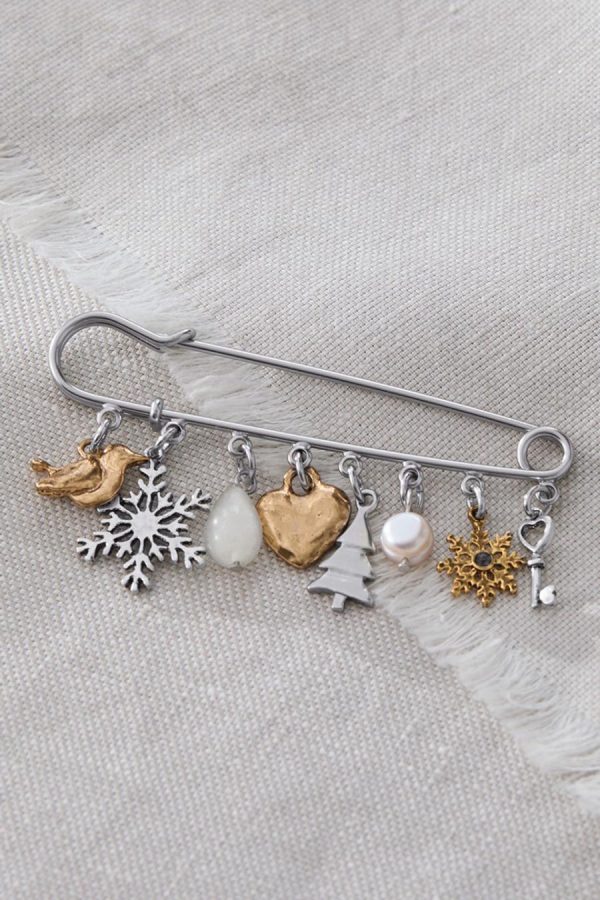 Charm your way through sweater weather – or wear on scarves, coats or hats. Two-tone metal snowflakes, cultured freshwater pearl and glass beads, along with heart and bird charms.